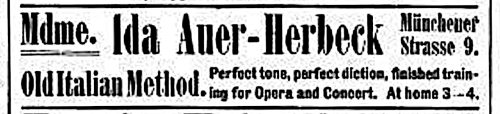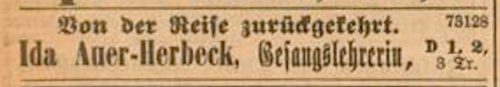 Ida Auer-Herbeck (16. Februar 1851 Dijon, Frankreich – 16. August 1915 Toronto, Kanada), Sopranistin, war von 1874 bis mindestens 1879 am Nationaltheater Mannheim als Opernsängerin und auch als Bühnenschauspielerin engagiert, wo sie den Theatermaler und späteren Technischen Direktor des Nationaltheaters Oskar Auer (1851-1923) heiratete. Später war sie Hofopernsängerin in München, ab etwa 1888 Gesangslehrerin am Konservatorium in Mannheim, ab September 1897 (1896?) als Hochschullehrerin am Dresdener Königlichen Konservatorium, 1909/10 bis 1913/14 am Stern’schen Konservatorium der Musik in Berlin und ab 1914 an der Kanadischen Musikakademie in Toronto, Kanada. Sie veröffentlichte etwa 1910 in einem Berliner Verlag Gesangsübungen. Aus Rezensionen: